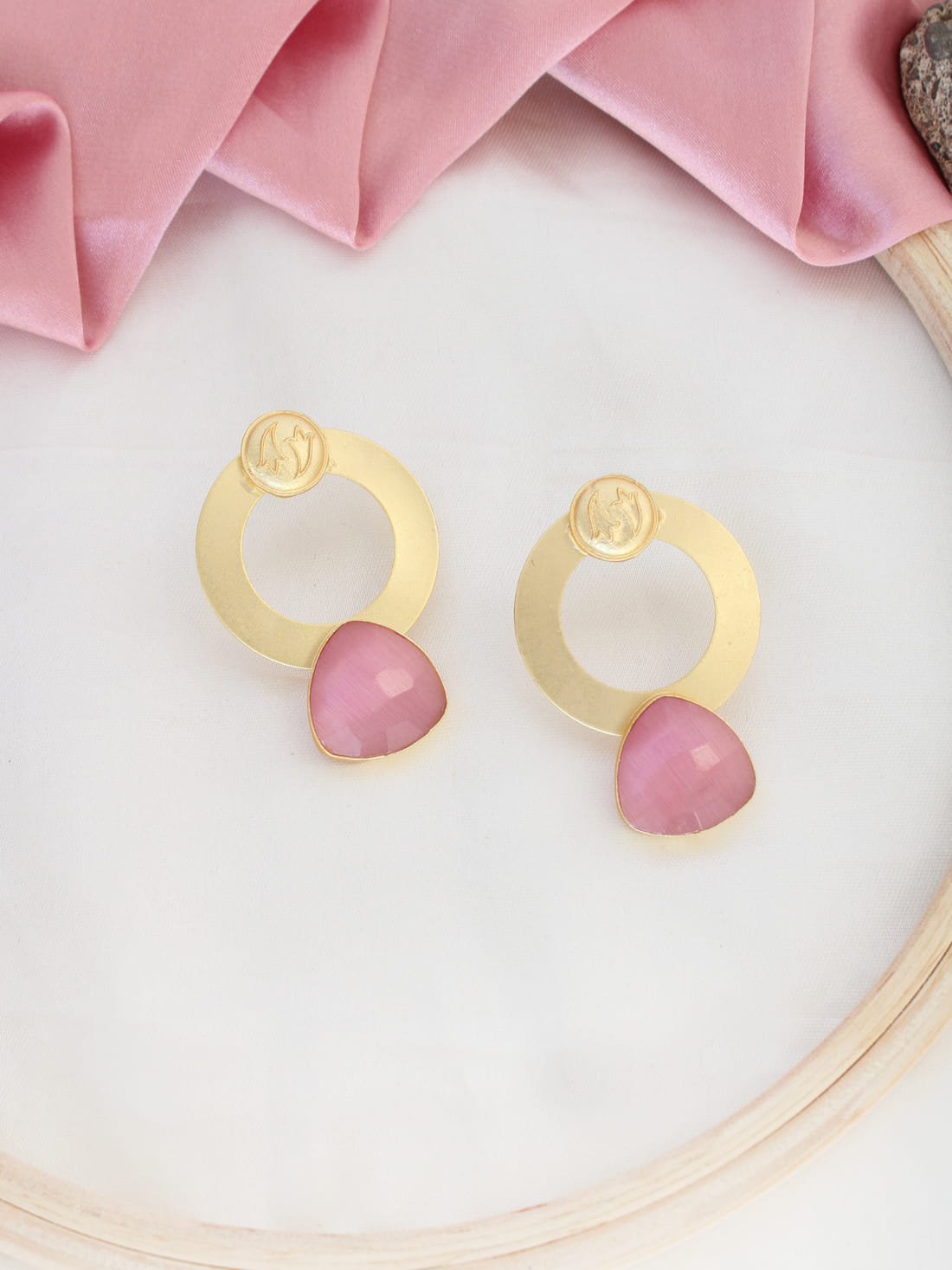Pink Color Stone Triangle Earrings